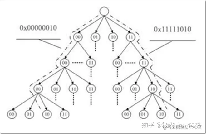 比如下图表示 0x000000 至 0x11111111 的偏移范围,树的高度为4 (图是网上找的,不是自己画的)