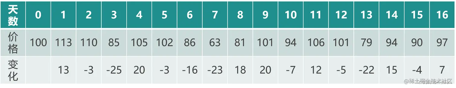int[] priceArray = {100, 113, 110, 85, 105, 102, 86, 63, 81, 101, 94, 106, 101, 79, 94, 90, 97};//价格数组