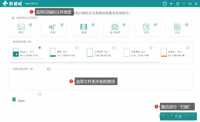 第2步:进入首页,以实际丢失情况为准选择丢失的文件类型、文件位置,例:图片在内存卡丢失,则选择图片文件和可移动设备这个路径(内存卡需要以读卡器成功连接电脑才可显示),随后“扫描”;