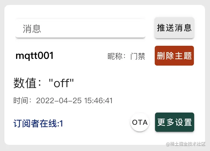 于此同时,你也会收到订阅消息,内容是 “on”,剩下的就是在收到“on”时处理开门逻辑了。
