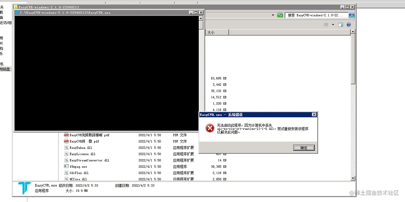 近期某现场用户更换Windows系统EasyCVR新版本包时,运行应用程序提示异常:计算机缺少dll文件。