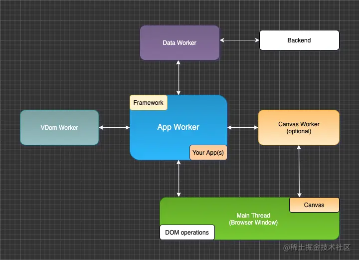 使用一个应用工作者作为主要角色,让主线程尽可能地闲置。虚拟DOM是实现这一目标的必要条件,因为你的应用程序(包括你的组件)生活在App worker里面。