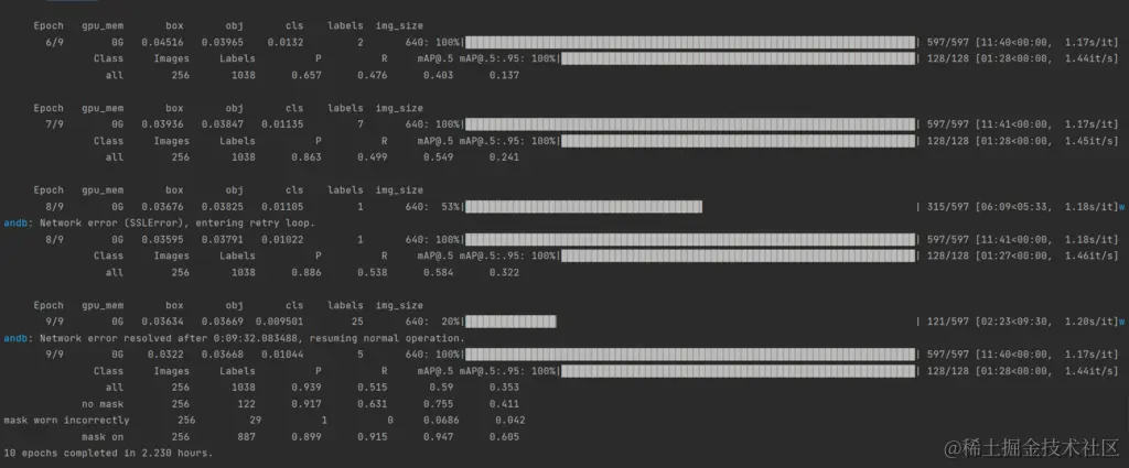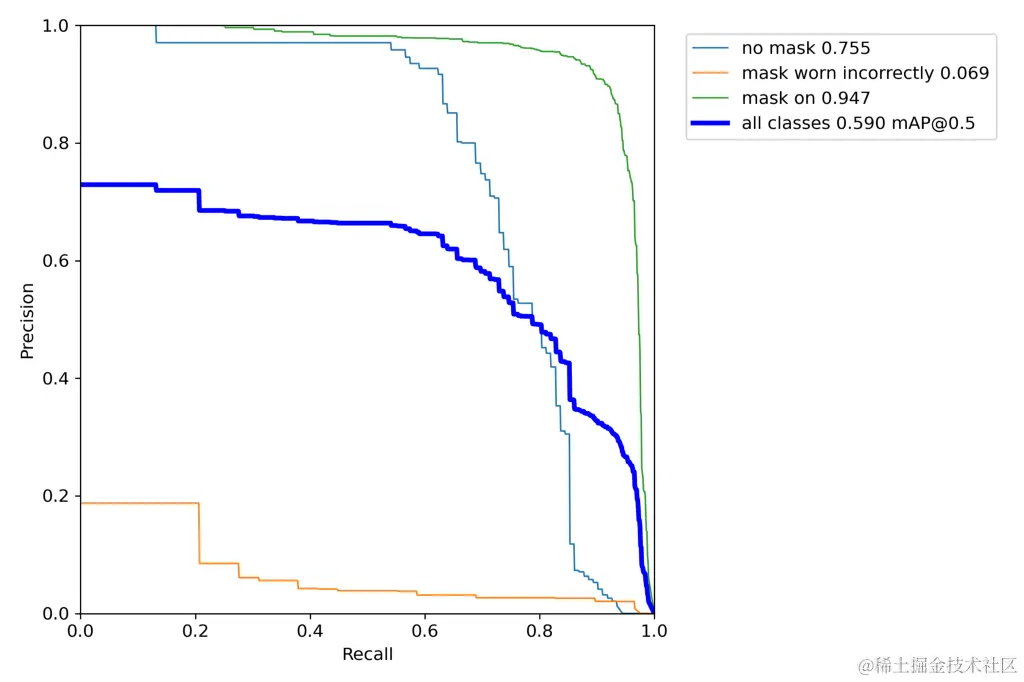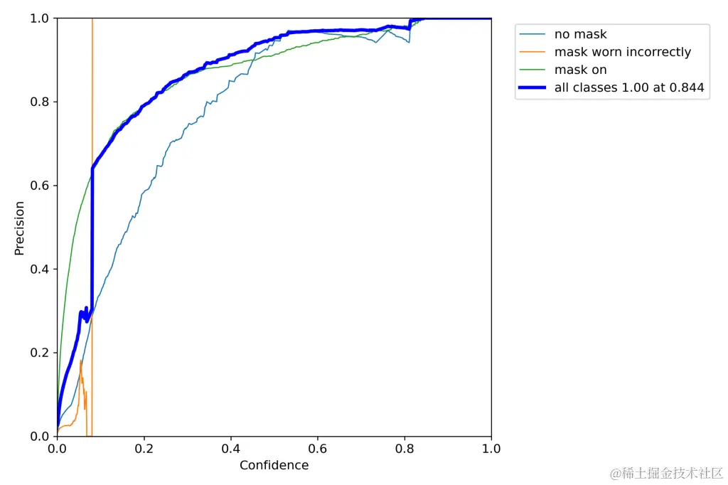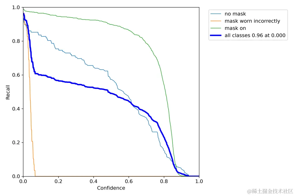 随着置信度分数的增加,召回率单调下降,而精度可以上升和下降,但对于这个项目来说,所有类别(除了戴错的面具)都会增加。