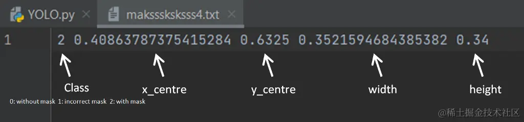 在用模型训练数据之前,必须将PASCAL VOC XML格式的注释数据改为YOLO格式,每幅图像有一个*.txt文件,规格如下。(也可以用下面的例子图片maksssksksss4.png来说明)