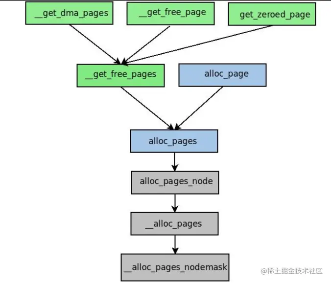 该分配器通过几个函数和宏来请求页框,它们之间的封装关系如下图所示。