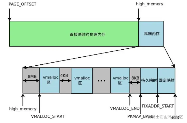 - 从图中可以看出,内核采用了三种机制将高端内存映射到内核空间:永久内核映射,固定映射和vmalloc机制。