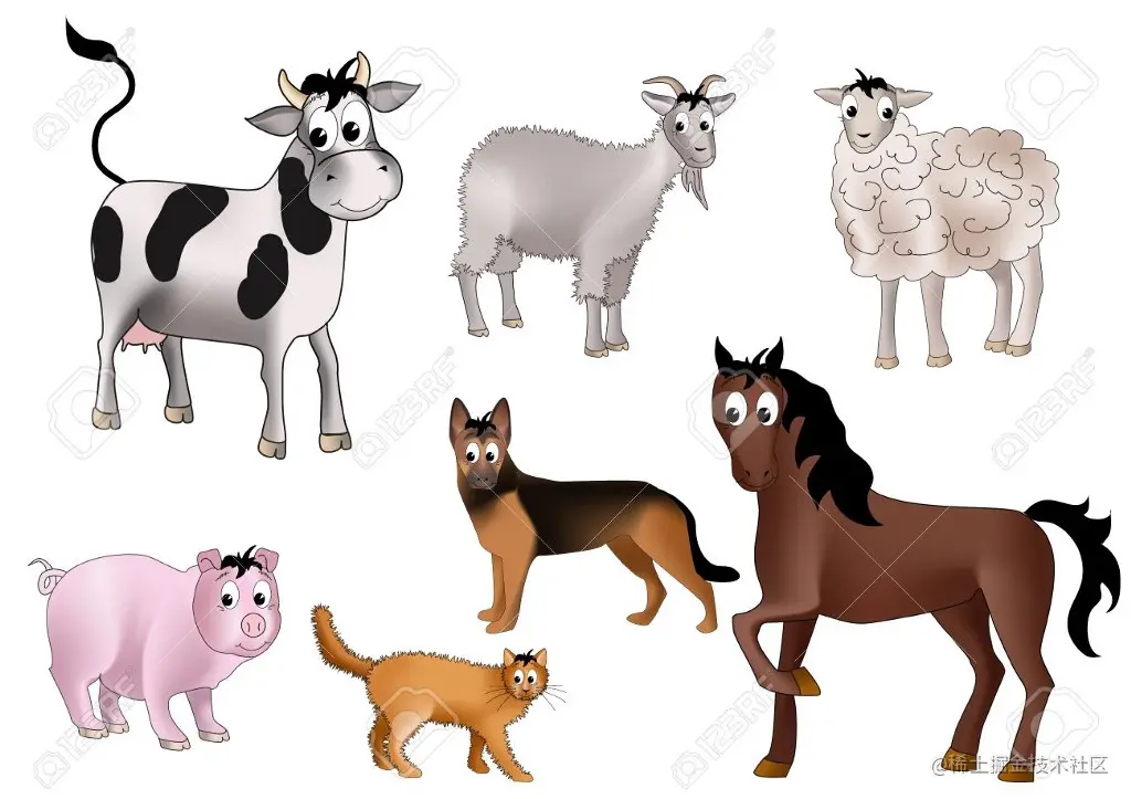 有一个叫做Animal的类。动物类有猫、狗和牛等对象。
