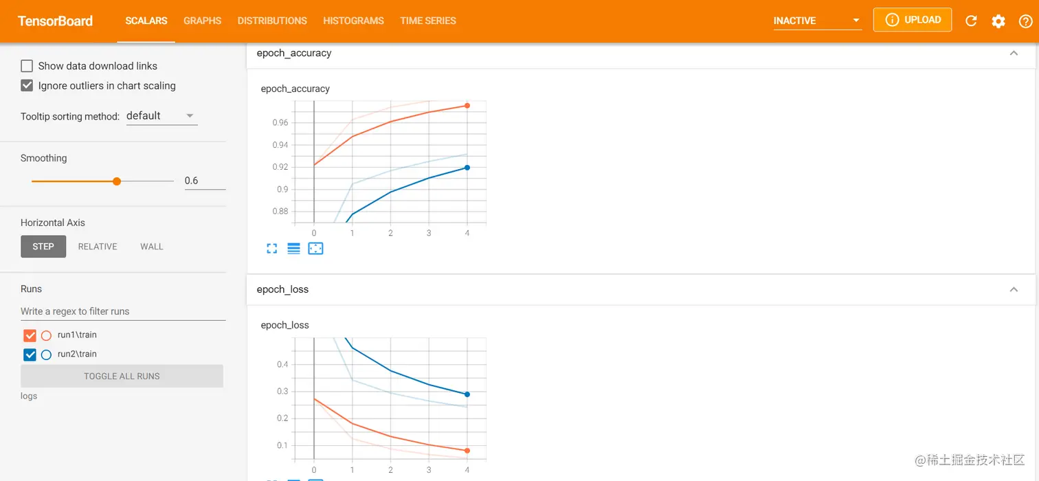 现在,当我们看到TensorBoard仪表板时,它将以橙色和蓝色的线条显示两个运行的信息,用于准确性和损失图。