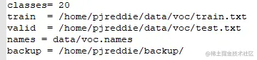 以 voc 格式数据来说,对于模型推理一般首先需要加载 voc.data 中的 classes 和 names,而其中的 train 和 valid 主要是训练的时候需要的数据集,来看一下 vod.data 的样子: