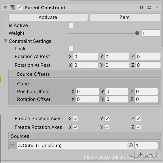 - Freeze Position Axes:要冻结的移动轴,冻结的轴向才能关联目标对象自动移动