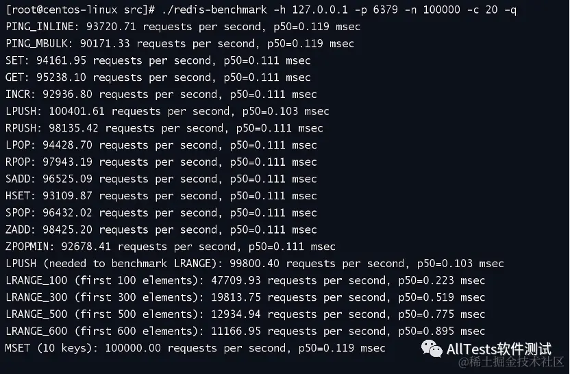 ./redis-benchmark -h 127.0.0.1 -p 6379 -n 100000 -c 20 -q