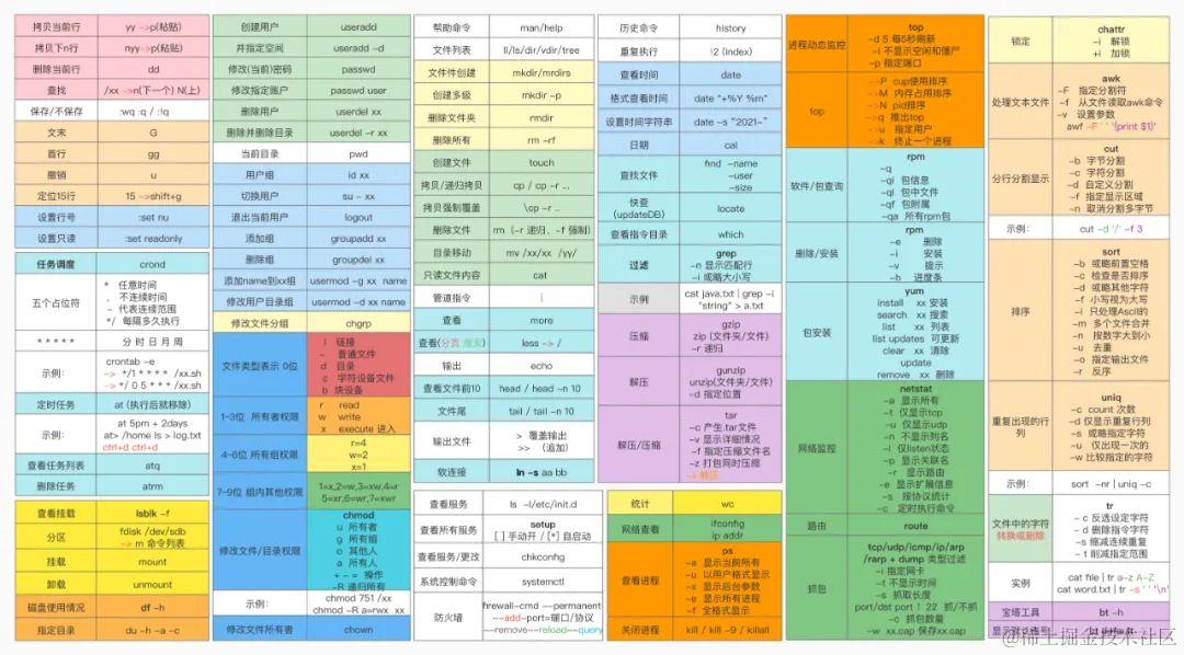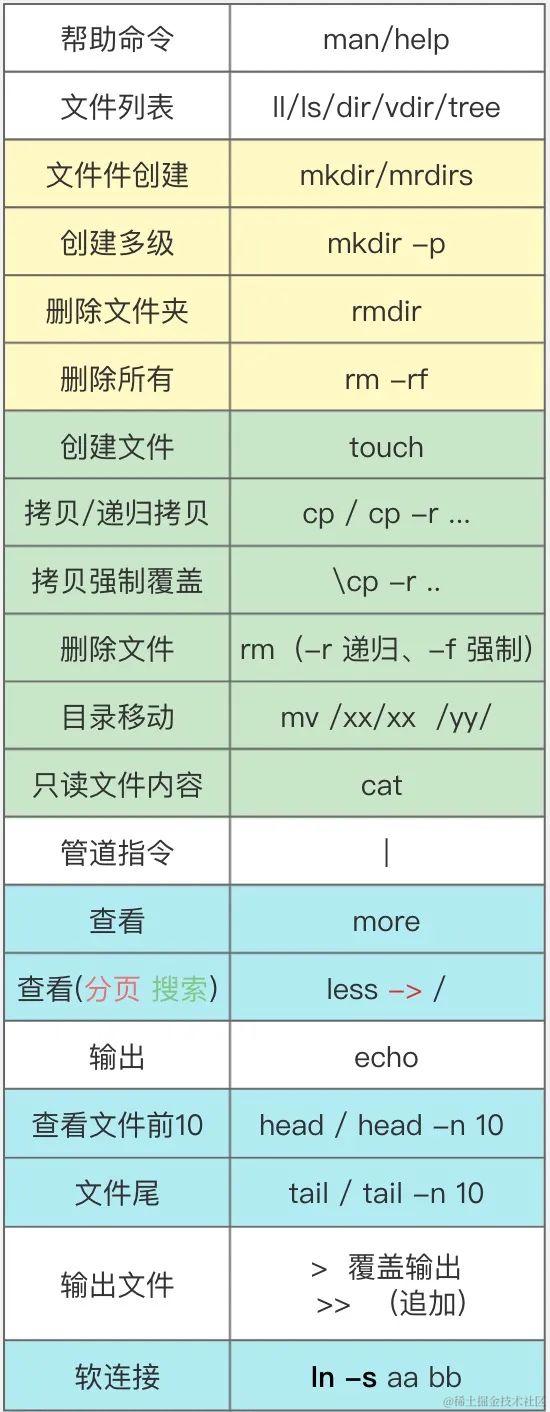 Linux 常用命令壁纸 Meng 2022-04-25 567 阅读1分钟 目录 1、Linux目录 2、常用命令 3、常用命令壁纸 1、Linux目录 Linux 的基本思想有两点:第一,一切都是文件;第二,每个文件都有确定的用途。其中第一条详细来讲就是系统中的所有都归结为一个文件,包括命令、硬件和软件设备、操作系统、进程等等对于操作系统内核而言,都被视为拥有各自特性或类型的文件。 2、常用命令 3、常用命令壁纸 要想获取高清壁纸资源,扫描作者微信 回复「 Linux 常用命令壁纸 」即可 获得全部资源