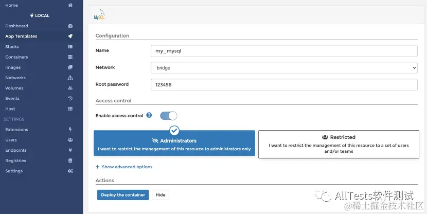 例如添加MySQL容器,设置名称、密码等信息,点击Deploy the container,进行容器部署。