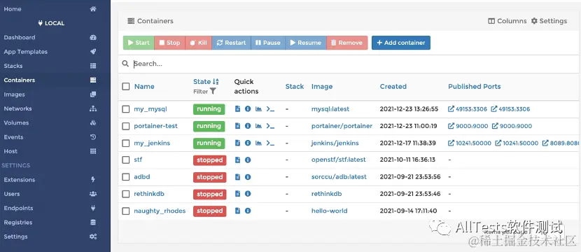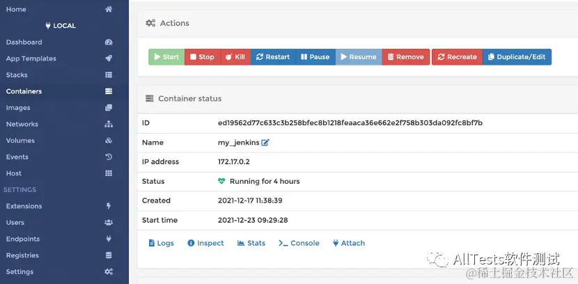 点击左侧Containers,显示已部署的所有容器。可进行日志查看、统计信息、控制台操作等。
