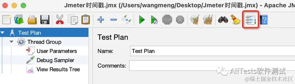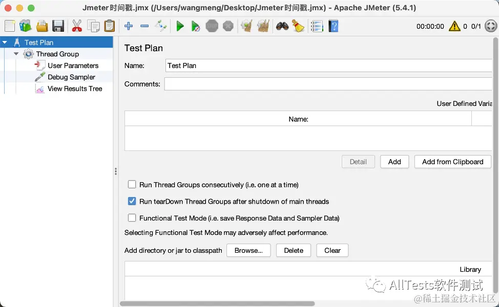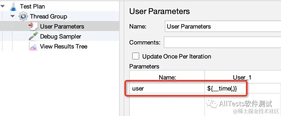 1、打开 Jmeter,例如:测试计划里,依次创建线程组、用户参数、调试采样器、查看结果树。