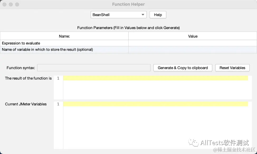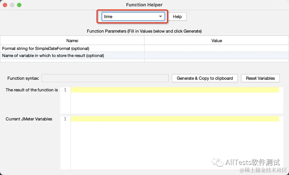 Function syntax 显示此函数的语法,如 ${__time(,)}