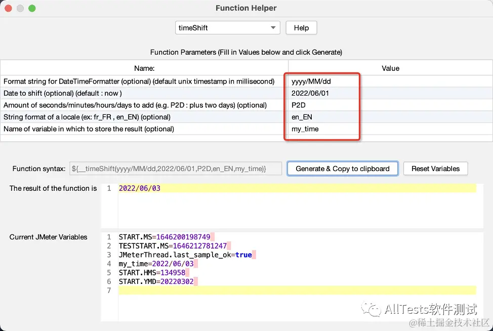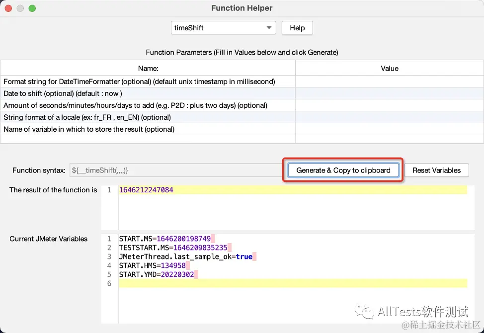 Function syntax 显示此函数的语法,如 ${__timeShift(,,,,)}