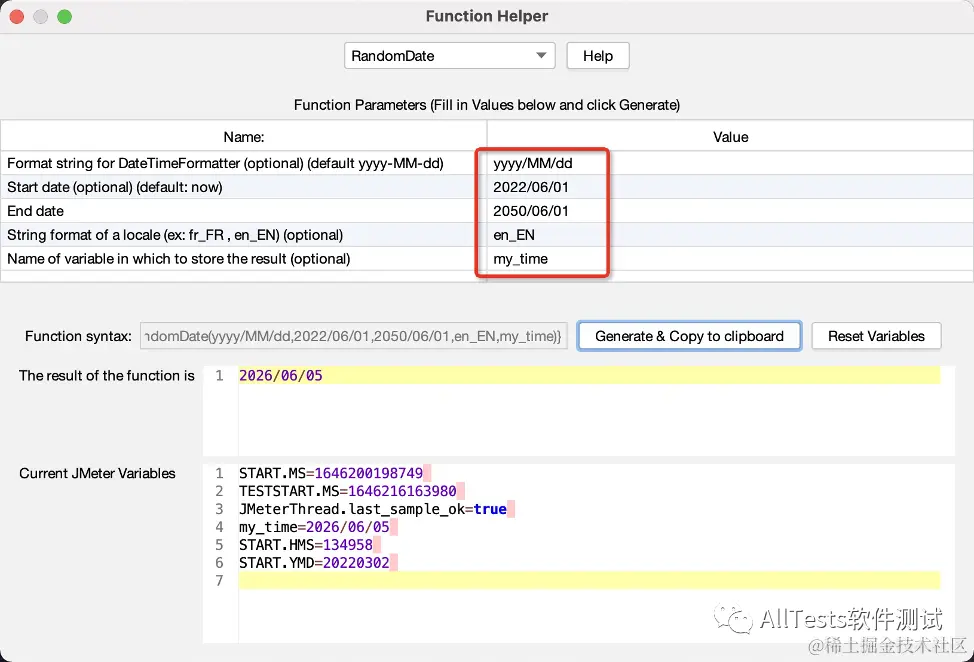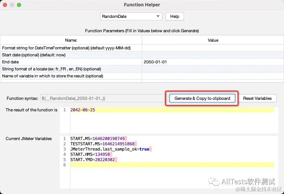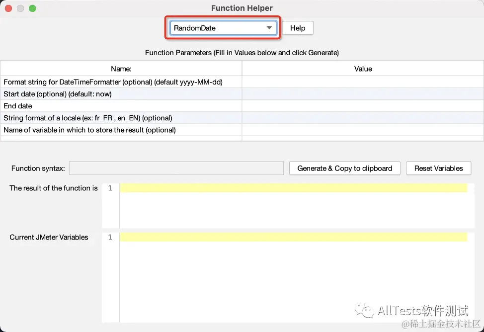 Function syntax 显示此函数的语法,如 ${__RandomDate(,,2050-01-01,,)}