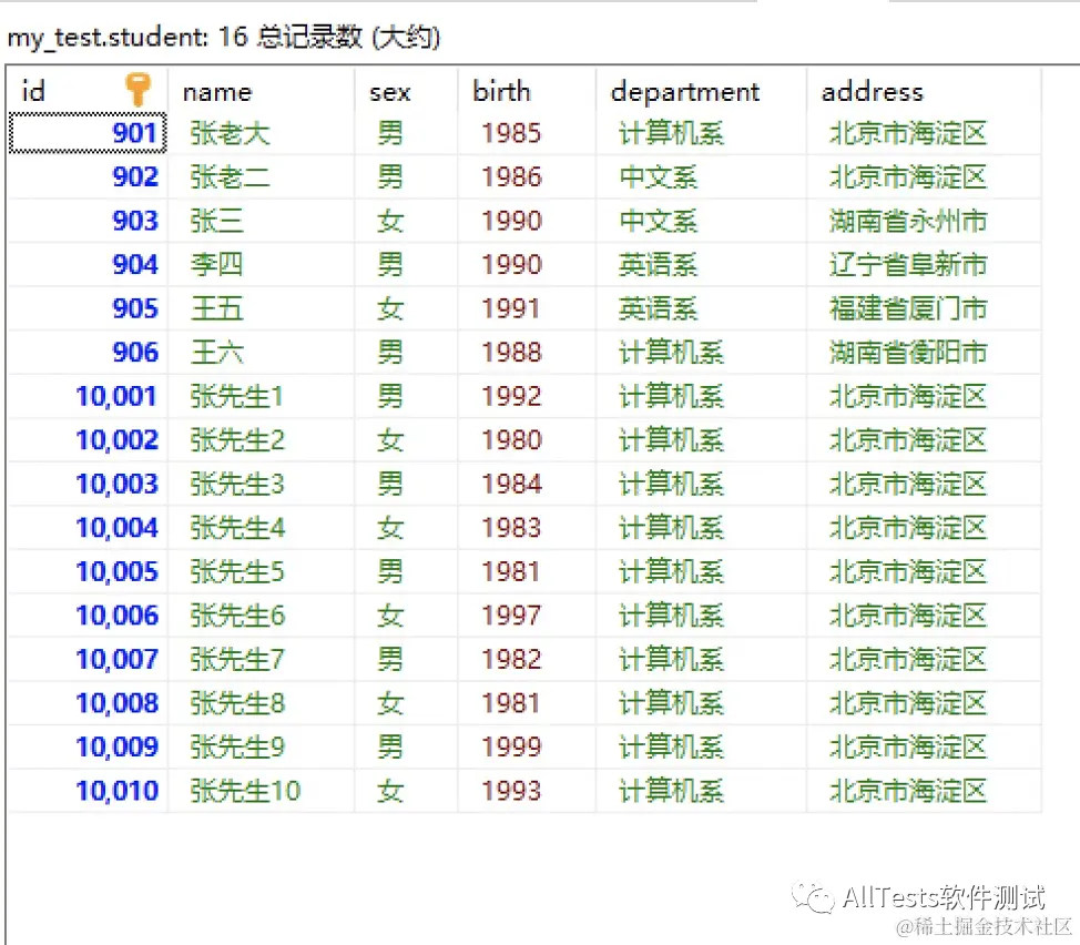 VALUES(CONCAT(10000 + i), CONCAT('张先生', i), if(i % 2, '男', '女'), FLOOR(1980 + RAND() * 20), '计算机系', '北京市海淀区');