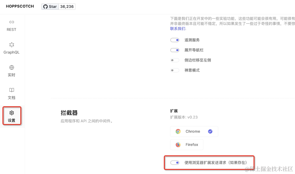 最后,点击设置,打开使用浏览器扩展发送请求。