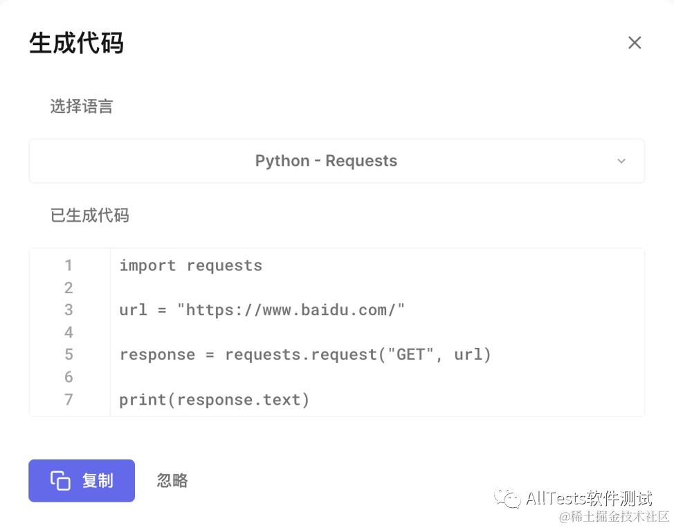 弹出生成代码框,可以选择不同的语言,这里选择 Python - Requests。