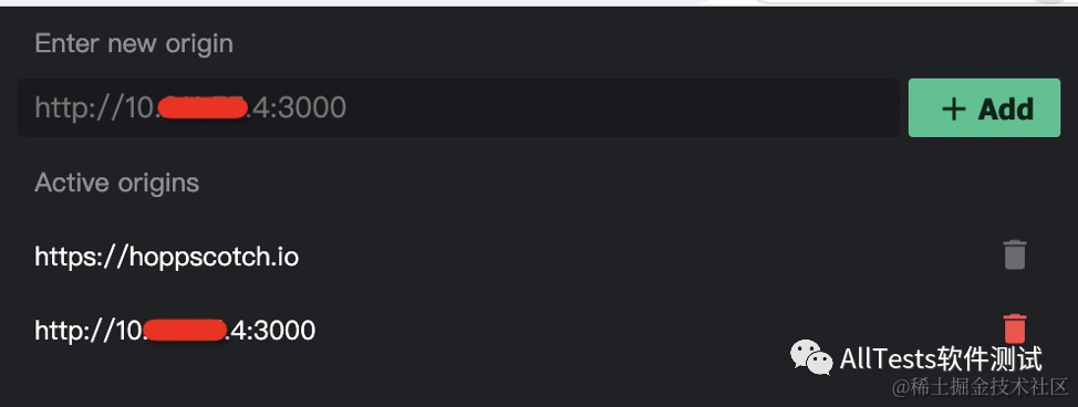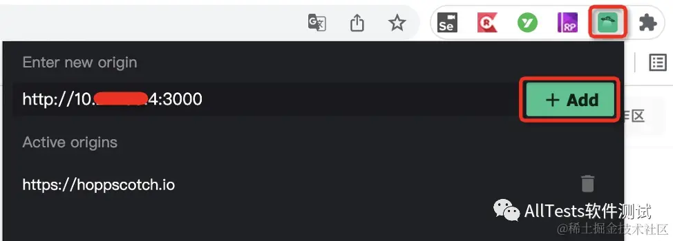 插件安装完成后,点击插件图标,点击 Add,添加 origin 地址(部署的服务器地址),以支持跨站请求。