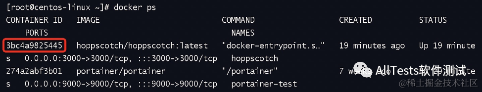查看容器ID,例如3bc4a9825445