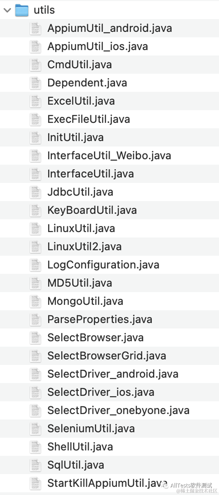 (6)utils 目录存放公共方法。各种点击事件、读写 Excel 表格、初始化数据、调用命令行、接口方法封装、MySQL 操作(增删改查)、键盘操作、SSH 命令操作、MD5 加密、MongoDB 操作(增删改查)、驱动本地/远程浏览器、封装 Selenium 方法和常用方法、启动与关闭 appium 服务等。