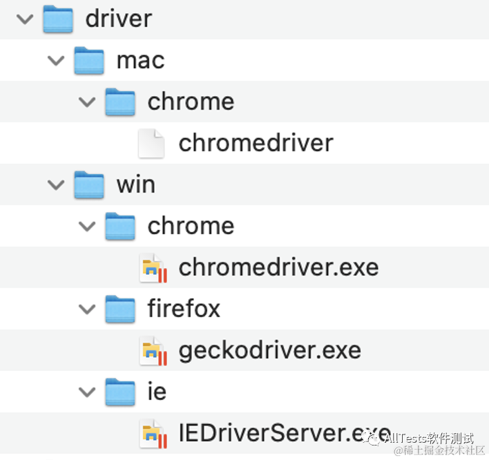 driver 目录存放浏览器驱动程序,按操作系统分为:Windows、Mac。