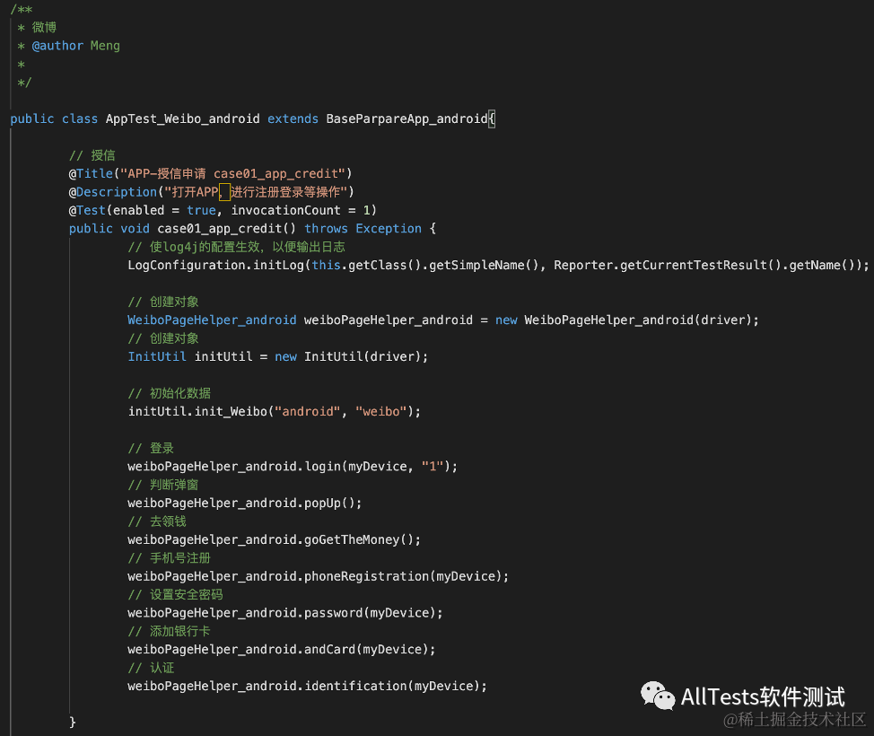 例如 AppTest_Weibo_android.java(授信,部分代码)
