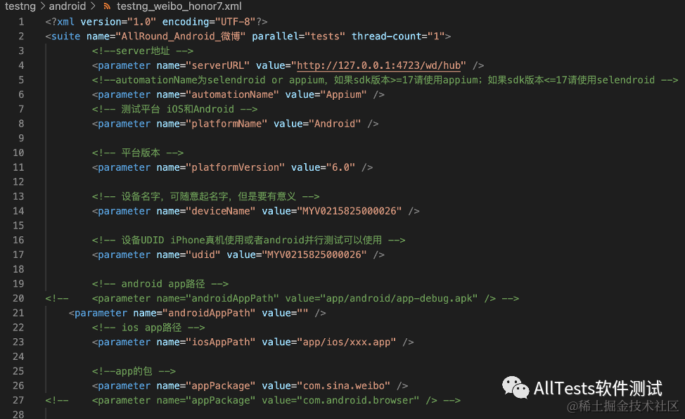 例如:testng_weibo_honor7.xml(配置参数,部分内容)