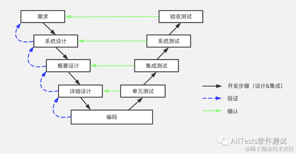 V 模型指出,单元和集成测试是验证的程序设计,检测程序的执行是否满足软件设计的要求。系统测试应当验证系统设计,检测系统功能、性能的质量特性是否达到系统设计的指标。测试人员和用户进行软件的确认测试和验收测试,追溯软件需求说明书进行测试,以确定软件的实现是否满足用户需求或合同的要求。