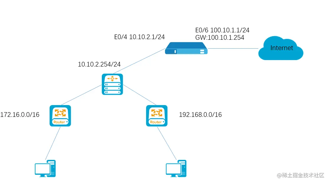 - 防火墙部署在互联网出口,运营商提供固定 ip:100.10.1.1/24(配置在 E0/6 接口)、网关:100.10.1.254、 DNS:114.114.114.114;