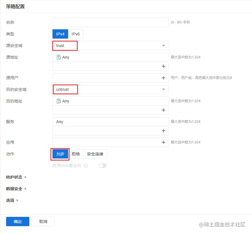 - 策略--安全策略中新建安全策略放行内网访问外网流量: