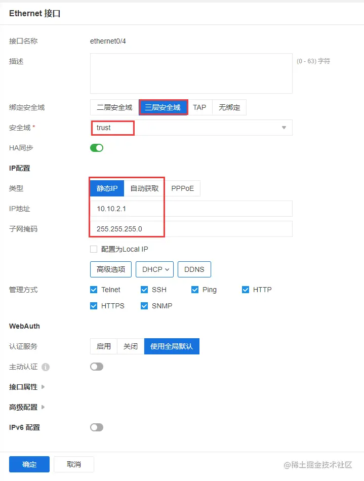 - 在网络--接口中编辑对应以太网接口配置 IP 、掩码和管理方式: