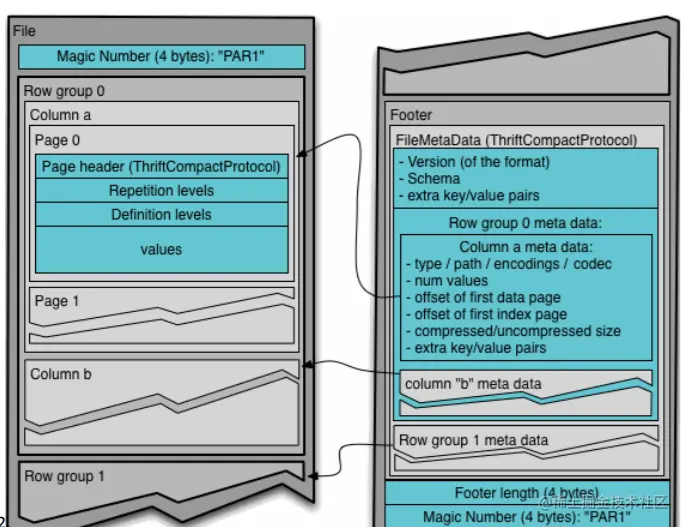 (2)列块(Column Chunk):在一个行组中每一列保存在一个列块中,行组中的所有列连续的存储在这个行组文件中。一个列块中的值都是相同类型的,不同的列块可能使用不同的算法进行压缩。