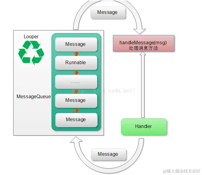 - 调用Looper的loop()方法之后,Looper对象将不断地从消息队列当中取出对象,然后调用handler的handleMessage()方法,处理该消息对象;如果消息队列中没有对象,则该线程阻塞