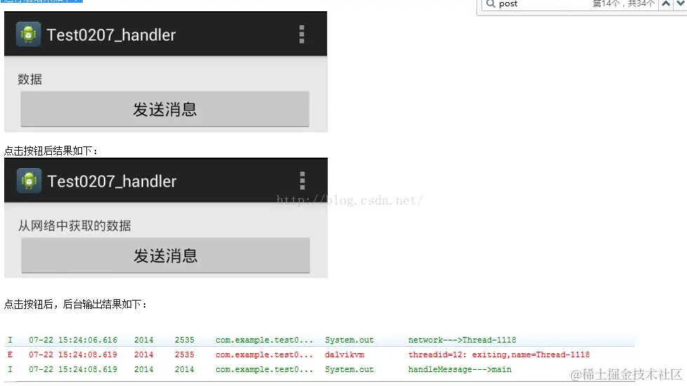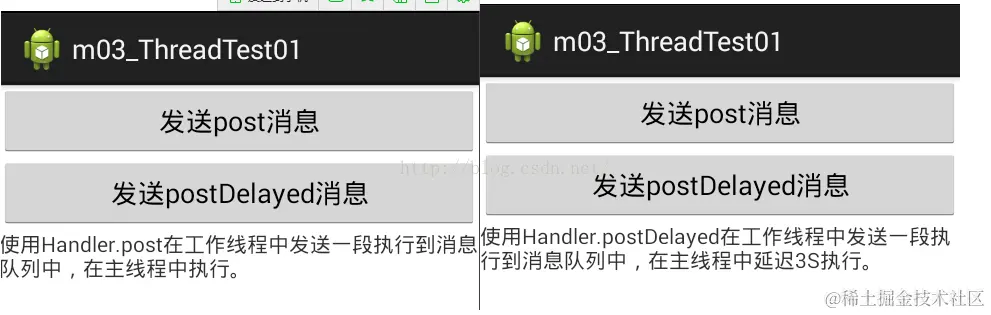有一点值得注意的是:对于Post方式而言,它其中Runnable对象的run()方法的代码(37行至39行或者58至61行),均运行在主线程上(虽然看上去是写在子线程当中的),如果我们在这段代码里打印日志输出线程的名字,会发现输出的是Main Thread的名字。所以对于这段代码而言,不能执行在UI线程上的操作,一样无法使用post方式执行,比如说访问网络。
