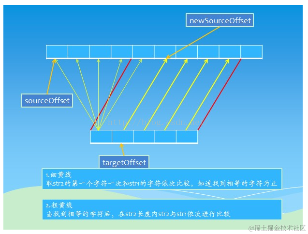 JDK中java.lang.String.indexOf(char[], int, int, char[], int, int, int)源码: