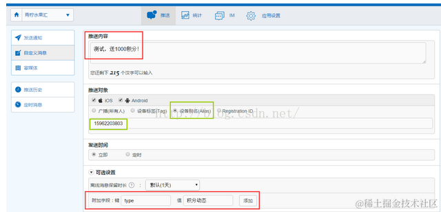 从上图可以看出,“可选设置”的“附加字段”中填写了键“type”,值“积分动态”,我们很容易的猜想到,这里应该是拼接了一个json字符串,当点击发送的时候,用户app将会接受到这个字符串。通过解析字符串,实现应用需要的推送效果。