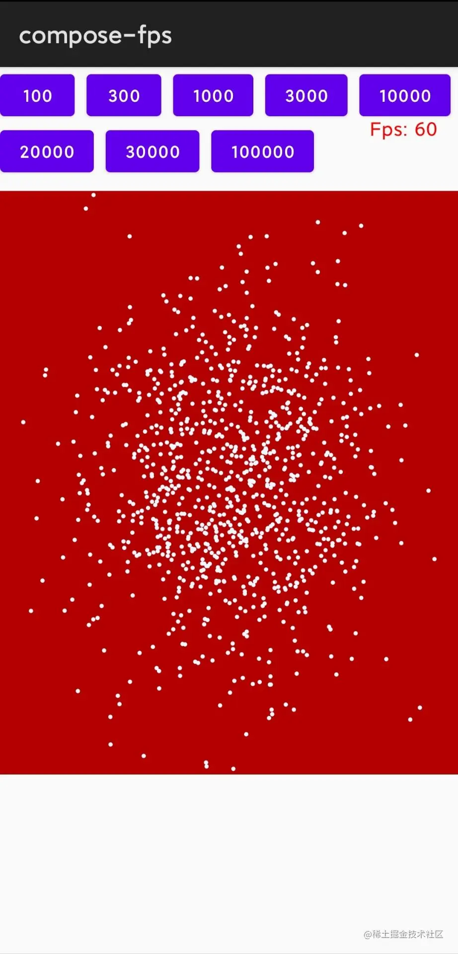 除了列表,我们也可以通过粒子动画的方式来测量Compose的性能,通过粒子动画我们可以评估在极端情况下Compose与View的渲染性能