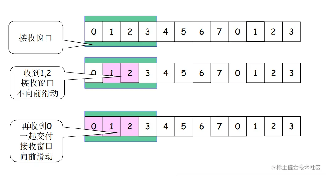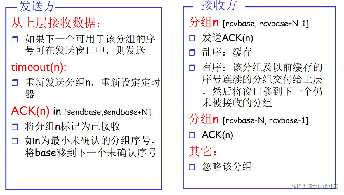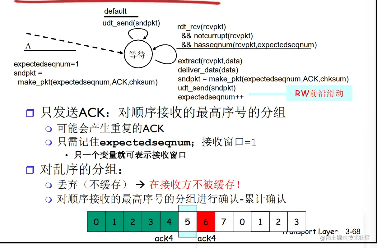 - GBN接收窗口等于1,只能按顺序接收,如果不是期待的分组则被丢弃