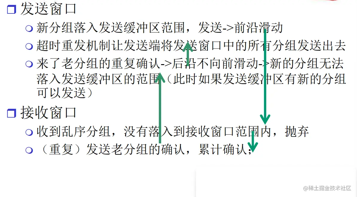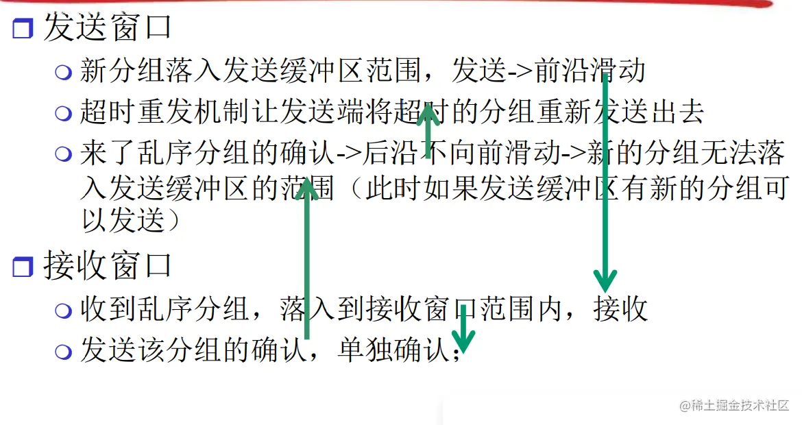 - SR接收窗口大于1,可以乱序接收,只需要重发没有接收到的分组即可