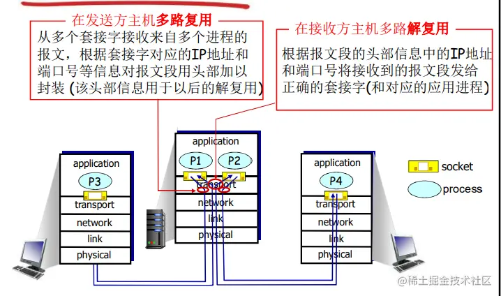 - 解复用作用:TCP或者UDP实体采用哪些信息,将报文段的数据部分交给正确的socket,从而交给正确 的进程