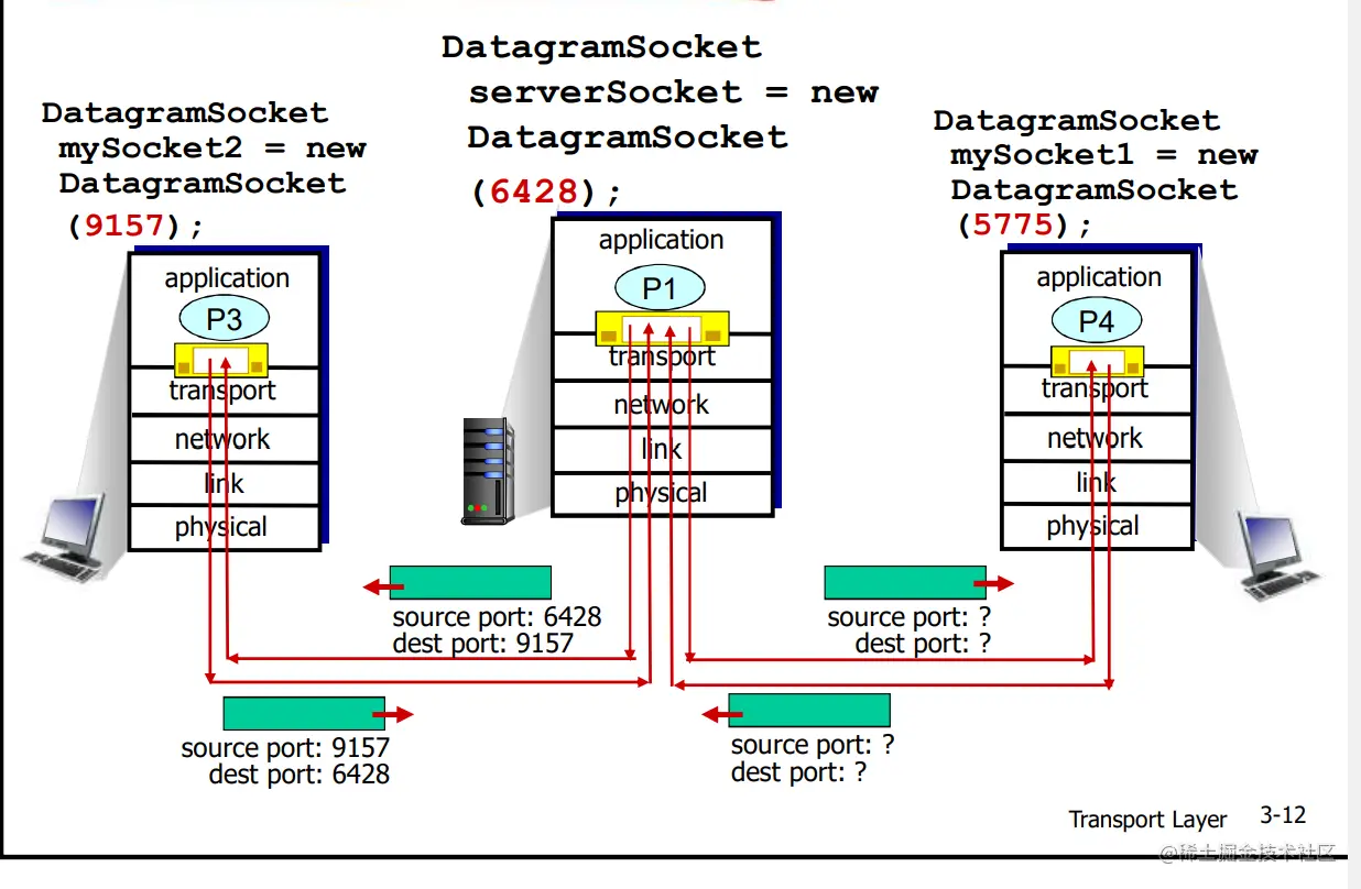 - 接收方:将报文段重组成报文,然后传递给应 用层