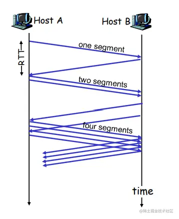 当CongWin<Threshold, 发送端处于慢启动阶段(slow-start), 窗口指数性增长.
