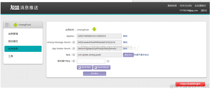 应用创建完成后,点击应用名称进入应用详情页面,进入“应用信息”页面,可以看到应用的AppKey和AppMasterSecret。