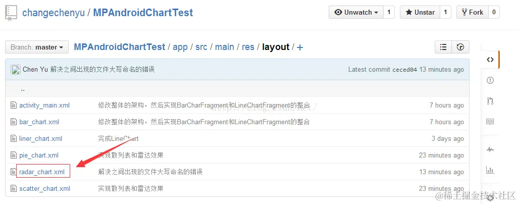 我先把本地radar_chart.xml复制一份,然后把这个文件删掉,然后commit->push,这样就干掉了,最后我再加上这个文件,然后commit->push.好了,分分钟解决,解决之后github上面的图片如下