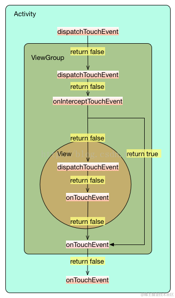 3、onInterceptTouchEvent返回为 true 时,将执行同级的onTouchEvent,而dispatchTouchEvent和onTouchEvent返回 true 时,将终止事件的传递。