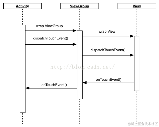 Activity 的 dispatchTouchEvent的事件分发给ViewGroup,ViewGroup先通过事件拦截onInterceptTouchEvent(只有 ViewGroup 才有此方法)来判断,是否拦截,如果没有拦截则将事件分发给 View 的分发机制dispatchTouchEvent;View 获取到事件后,就开始调用 onTouchEvent 方法,如果 View 的 onTouchEvent 未把事件消费掉,则把事件有传递给 ViewGroup 的 onTouchEvent,同理,ViewGroup 未把事件消费掉,继续往下级传到了 Activity 的 onTouchEvent 事件处理中。文字讲解终究是有点难理解,需要结合图文来讲解,那么我们来看下下面这张图,应该很清晰明了。